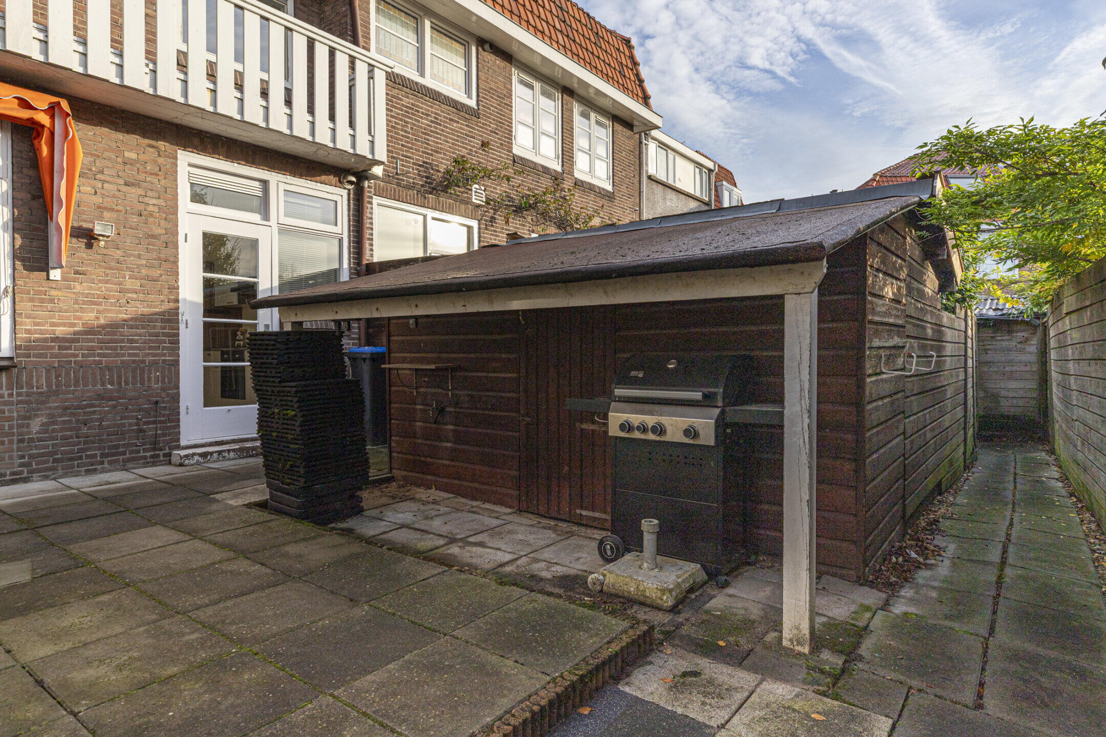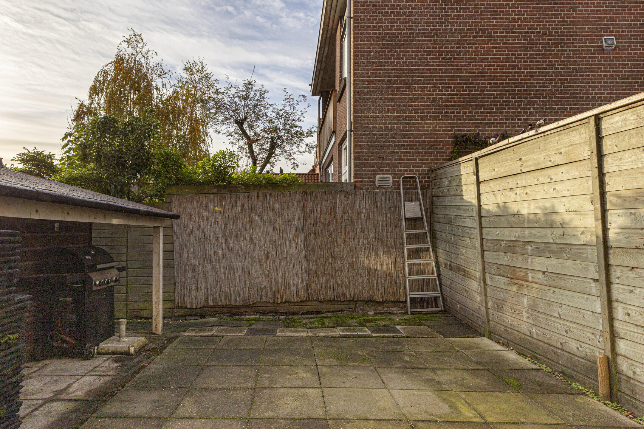 Op het zuiden gelegen achtertuin welke grotendeels bestraat is en v.v. een houten schuur en een omheining aan de zijzijde. Via de poort aan de achterzijde kun je de straat bereiken. Aan de achterzijde is het huis op de begane grond v.v. een markies.