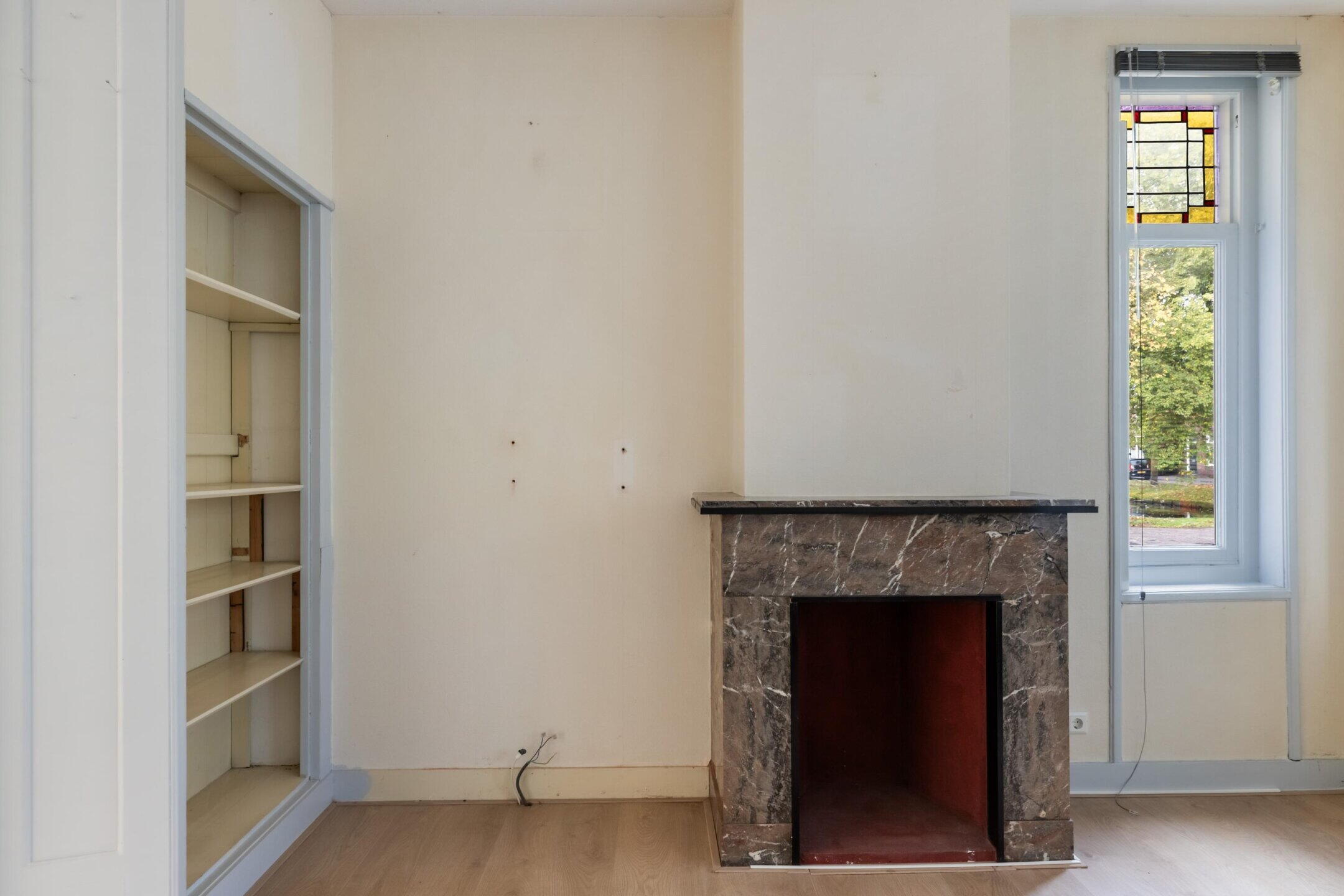De living is v.v. een viertal ruime vaste kasten en originele schuifdeuren. Het zitgedeelte aan de achterzijde heeft direct contact met de achtertuin.